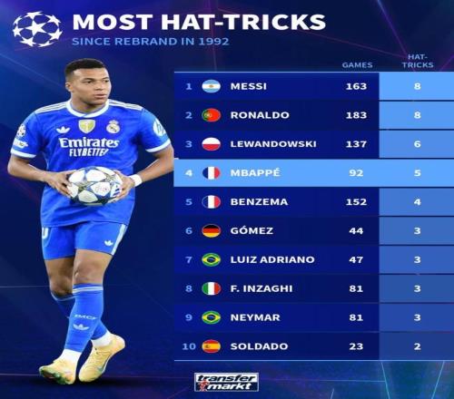 北京时间11月27日,在姆巴佩用一次大四喜帮助皇家马德里客场4-3战胜奥林匹亚科斯,赢得欧冠联赛阶段第5轮比赛的胜利之后,德转统计出了欧冠自1992年改制以来戴帽次数最多的球员,梅西和C罗同以8次并列第一,姆巴佩5次排名第四。